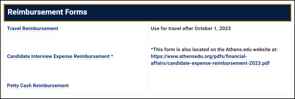 Reimbursement Forms November 15, 2023 22:58 Updated Accessing Reimbursement Forms: Login to MyAthens Portal. Type “Reimbursement Forms” in the Search field. Click the "Reimbursement Forms" page result. Choose the reimbursement form you are searching for by clicking the page link. Related articles Outlook Email Travel Information and Procedures MyAthens Portal Course Incompletes Access Athens