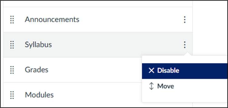In the Navigation menu, locate the Syllabus course link and click the vertical ellipsis (three dot) menu, and choose Disable.