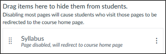 Alternatively, you can drag and drop the Syllabus option to the lower section that is labeled “Drag here to hide this option from students.”
